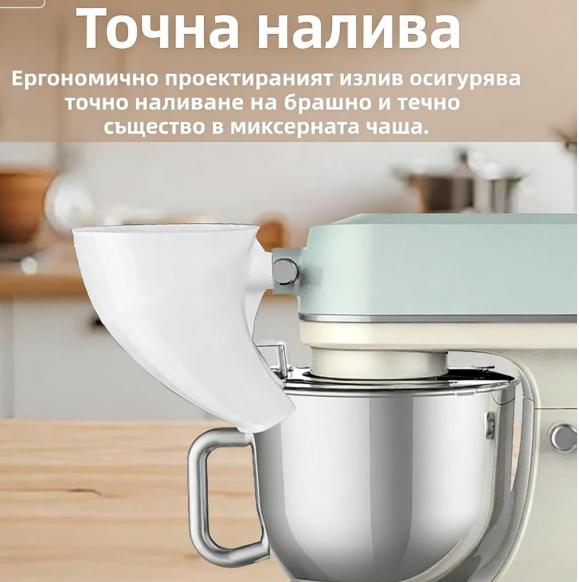 Широкият отвор и насочващият улей ви позволяват лесно да изсипвате брашно, захар, какао или яйчена смес.